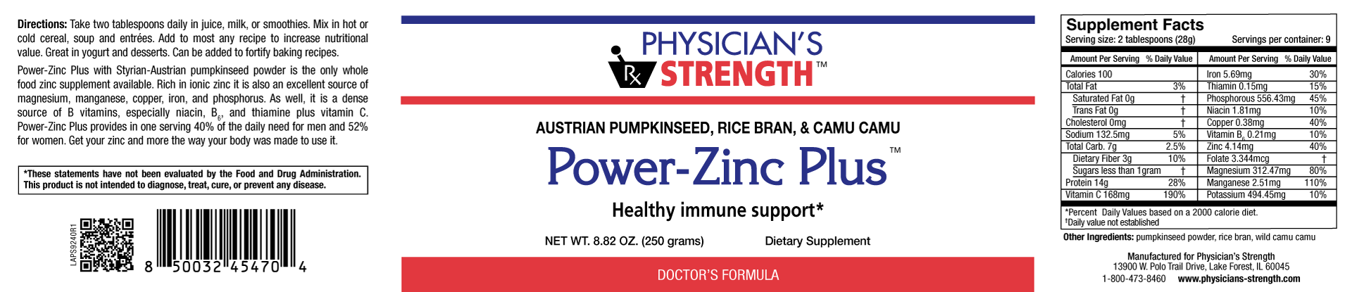Power-Zinc Plus with Styrian-Austrian pumpkinseed powder is the only whole food zinc supplement available. Rich in ionic zinc it is also an excellent source of magnesium, manganese, copper, iron, and phosphorus. As well, it is a dense source of B vitamins, especially niacin B6 and thiamine plus vitamin C. Power-Zinc Plus provides one serving 40% of the daily need for men and 52% for women. Get your zinc and more the way your body was made to use it.